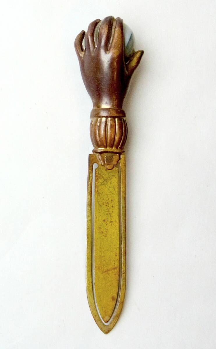 - 貴重 フランスアンティーク 乙女の手と珠 栞 ペーパーナイフ 幸運のお守り 天然石硝子玉 西洋骨董 真鍮 クロネコ宅急便60