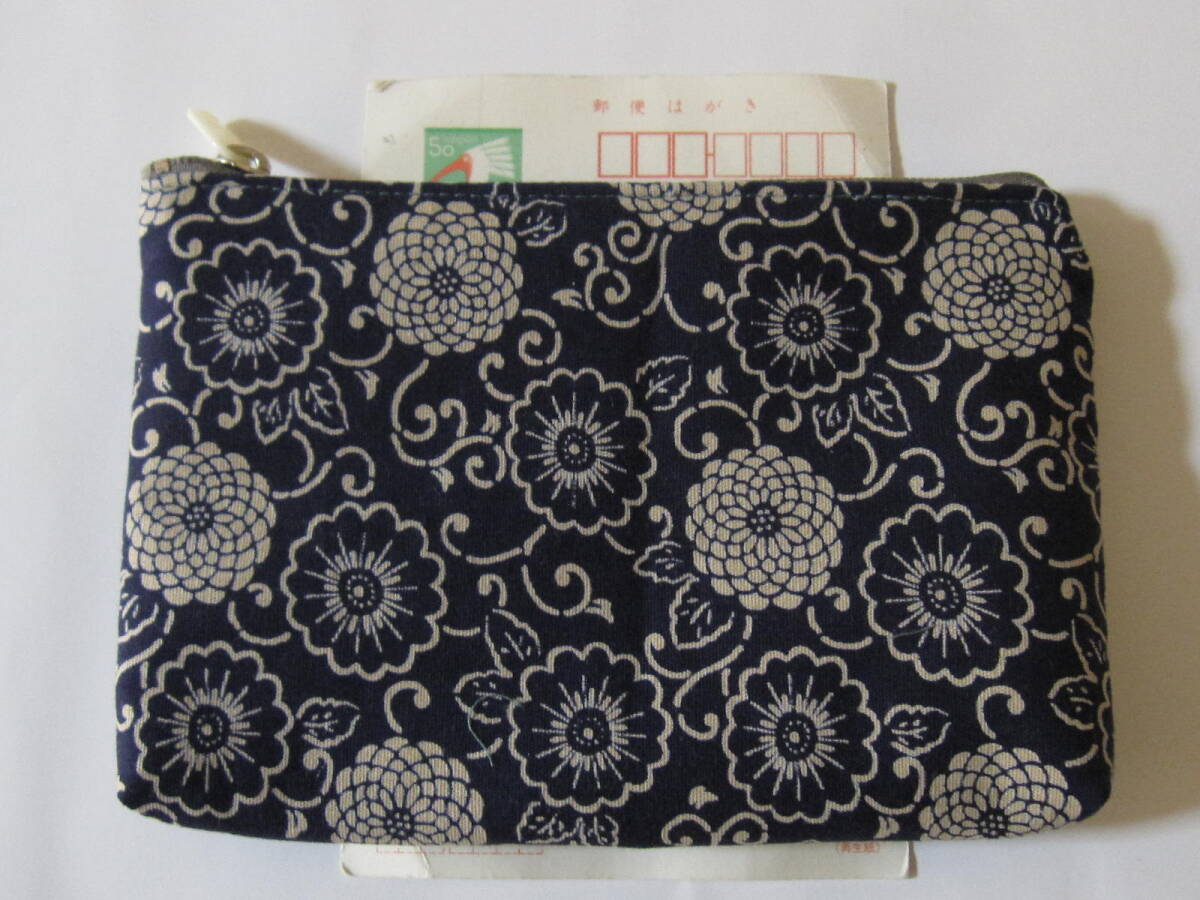 - 手作り 大 ポーチ 濃紺 牡丹菊 唐草 和柄 花 模様 華 格安 ハンドメイド 秋冬 財布 小物 充電器 眼鏡 男女 兼用 可愛 お洒落 綿 コン 幅広