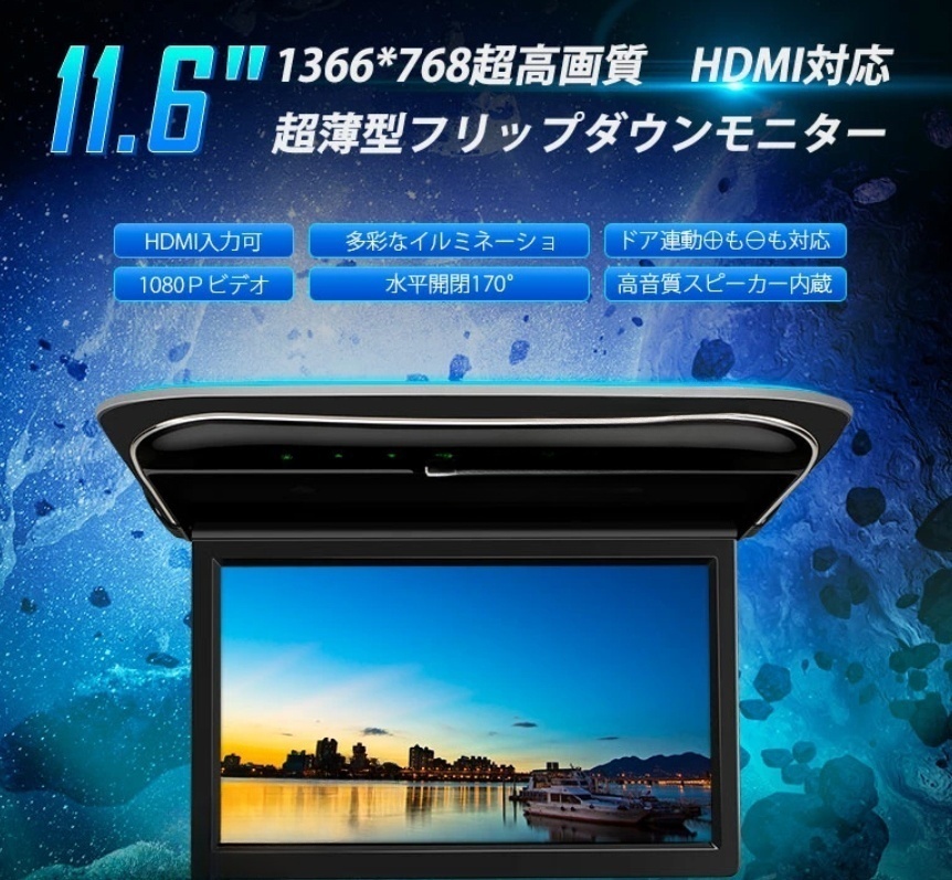 - 送料無料!11.6インチ フリップダウンモニター 1366x768高画質 HDMI対応 スピーカー付 1080Pビデオ ドア連動 開閉170度