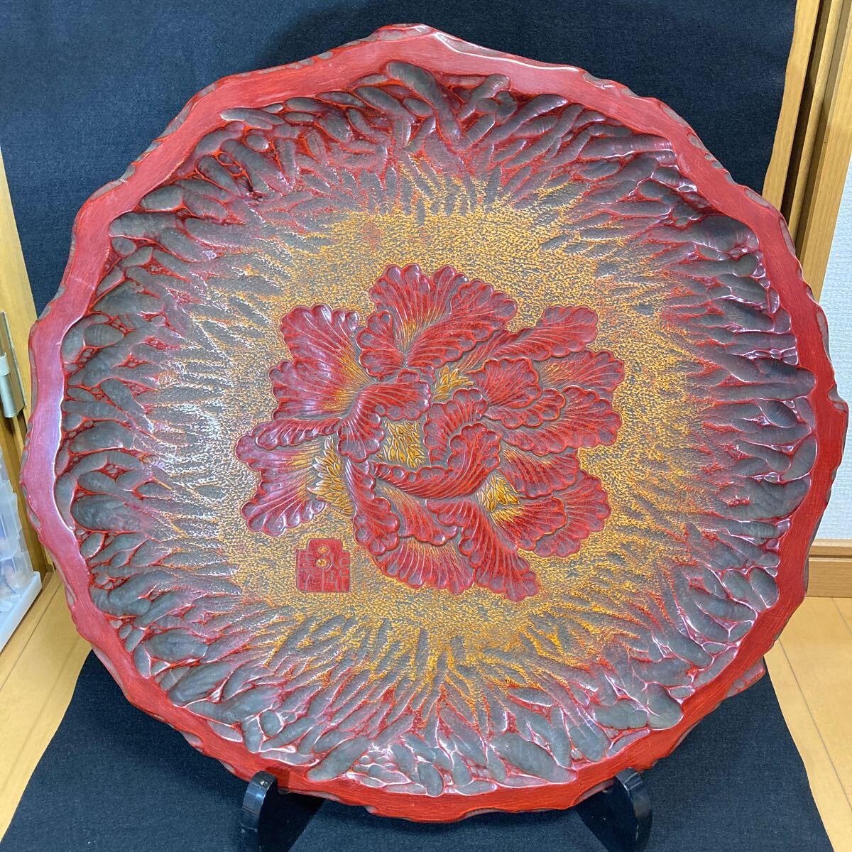 - 木彫 大振り 盆 牡丹 漆 茶道具 煎茶道具 直径約59㎝ 重量約2.66kg