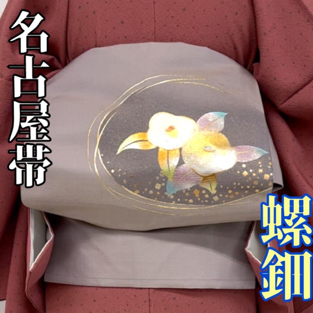 > 【着物と帯 時流】N25409◇正絹 九寸名古屋帯◇螺鈿 金彩 椿 くすみ紫