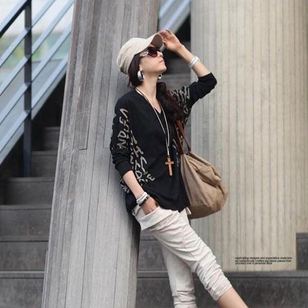 - トップス、長袖、ブラック、ドルマン袖、ゆるカットソー、英字プリント