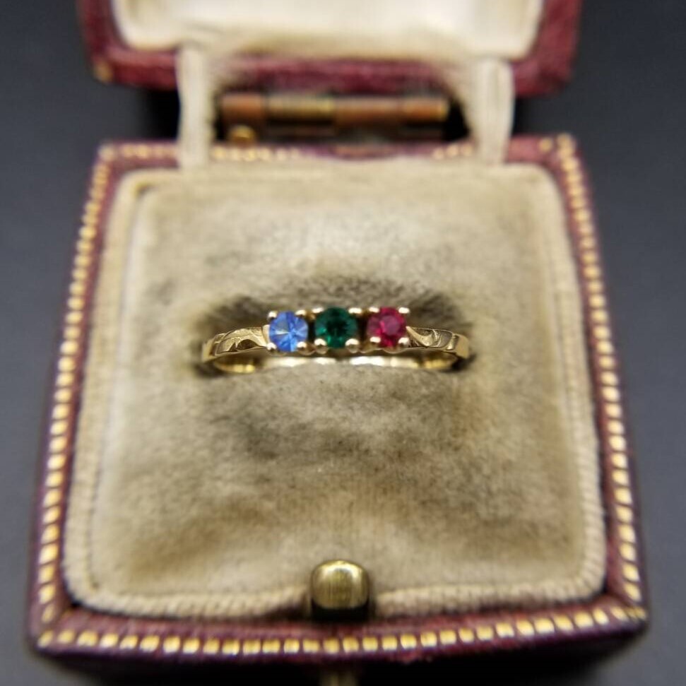 - セールスマンサンプル ヴィンテージ バースストーン リング ゴールドトーン ラインカット 指輪 レトロ トリコカラー 水色 緑 赤 Y22-F⑩