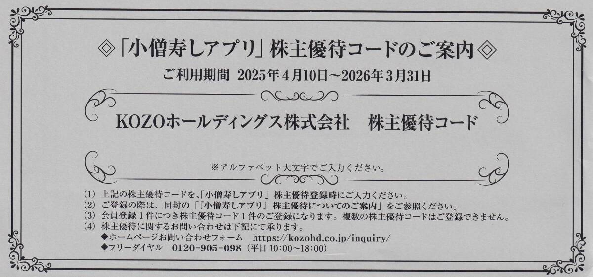 - 小僧寿しアプリ 株主優待コード 500円分 有効期間2025年4月10日~2026年3月31日迄