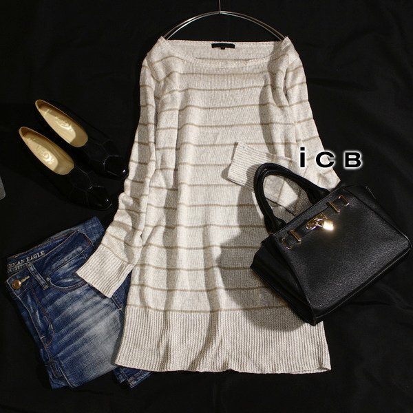 > 美品 オンワード樫山 iCB アイシービー 綺麗め ボーダー柄 リネン ニット チュニック S 春 夏 25C03