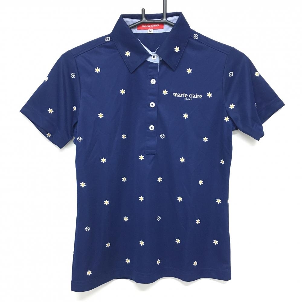 - 【美品】マリクレール 半袖ポロシャツ ネイビー×白 花刺しゅう総柄 レディース M ゴルフウェア marie claire