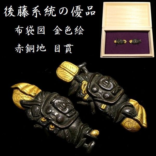 - 【 恵 #1591 】 後藤系統の優品 雰囲気良き布袋図 上質金色絵 赤銅地目貫 桐箱付 検:鍔/縁頭/切羽/ハバキ/刀剣/刀装具
