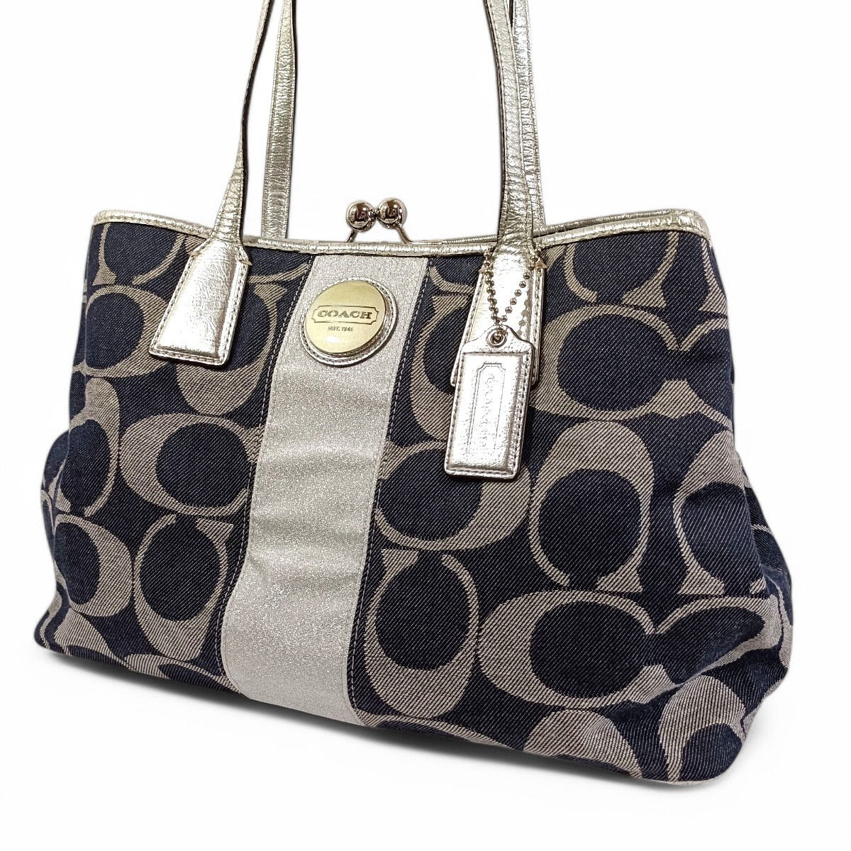 - 正規品 コーチ ハンドバッグ シグネチャー ネイビー がま口 キャンバス 鞄 かばん シルバー キャンバス トートバッグ 大容量 男女兼用