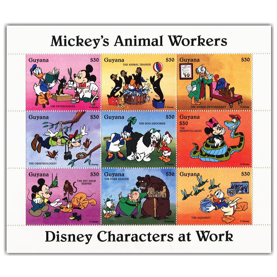 - ディズニー ミッキー ミニー ドナルド グーフィー プルート 切手9枚1シート(動物相手の仕事) Guyana 1995年