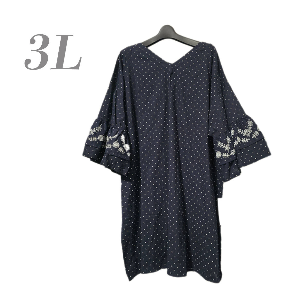 - ●新品/チュニック/ブラウス/ドット/花柄/フリル袖/3L/ネイビー●x0020