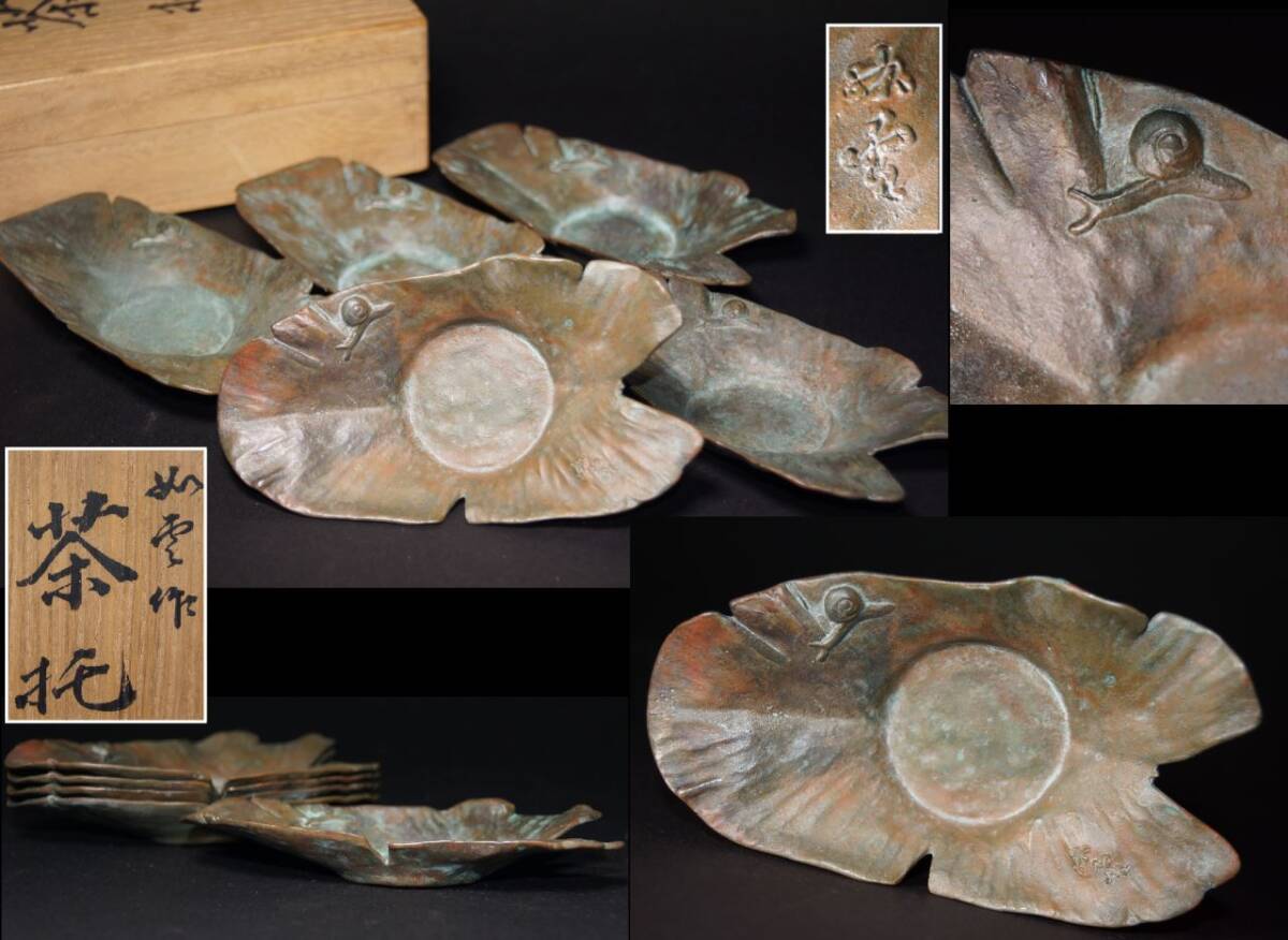 - 鋳金界の老大家■大島如雲 作■ 銅製 葉形 蝸牛茶托 五客揃 共箱 時代 金工 浮彫 カタツムリ 煎茶道具 茶器 真贋保証 かたつむり 青銅