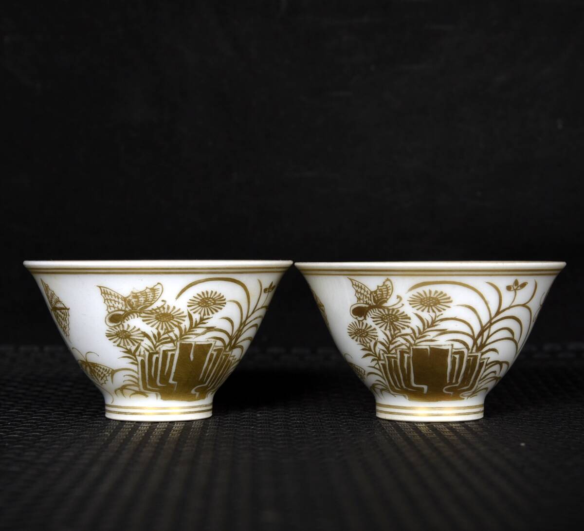 - ▽鴻▽ 明 成化年製款 描金 三秋碗一對 古陶瓷品 置物 古賞物 中国古玩 中国古美術