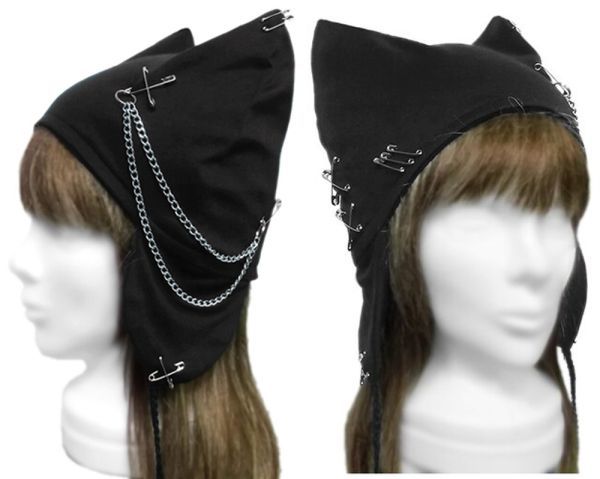 - ☆ハロウィン☆ ◇送料無料◇ ハンドメイド◆パンク[チェーン&ピンクロス] 耳あて付 猫耳帽子◆コットンニット/ブラック