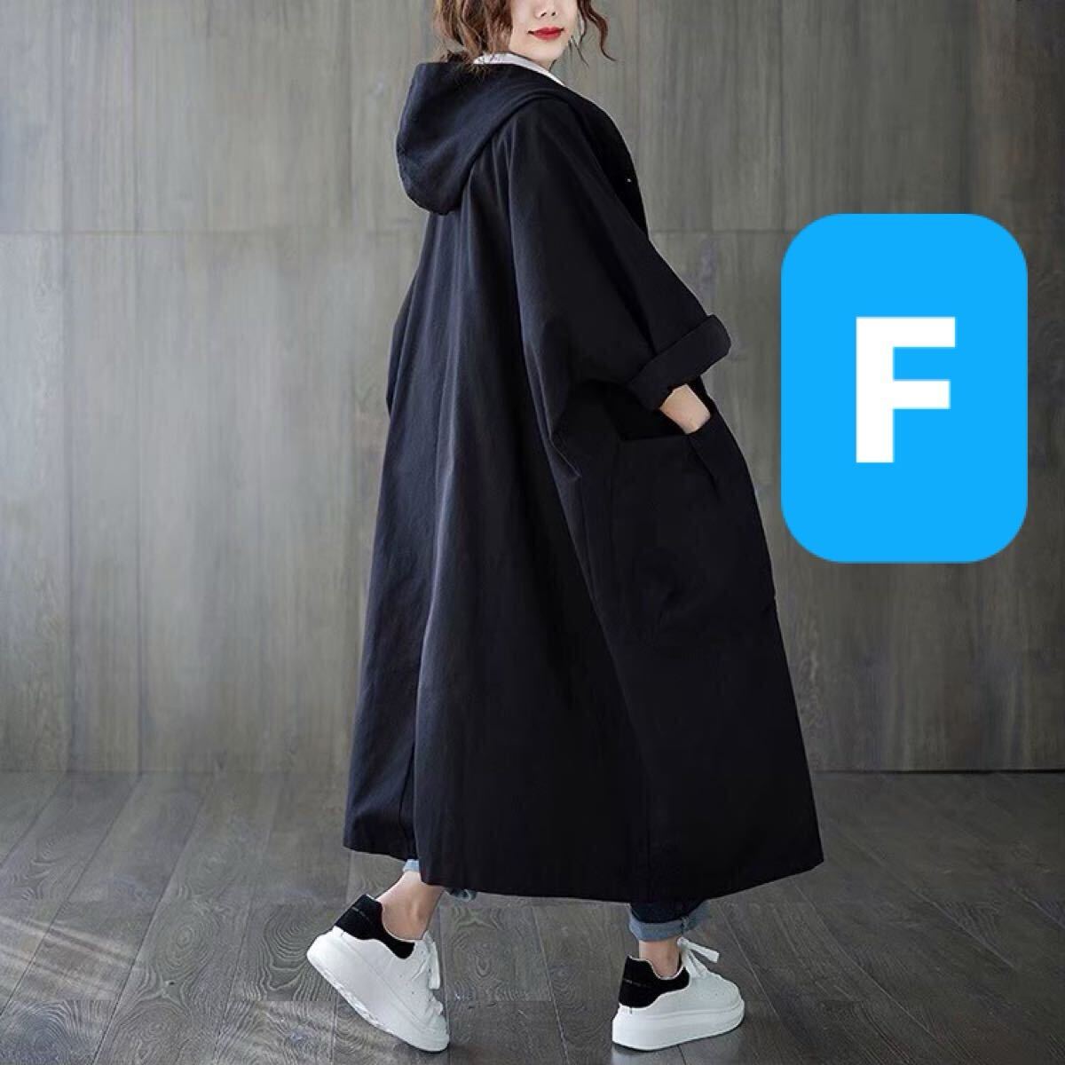 - ロングコート パーカー コート フード シングルトレンチ アウター セレブ トレンド ゆったり 入学 スーツ マタニティ ブラック 黒 F