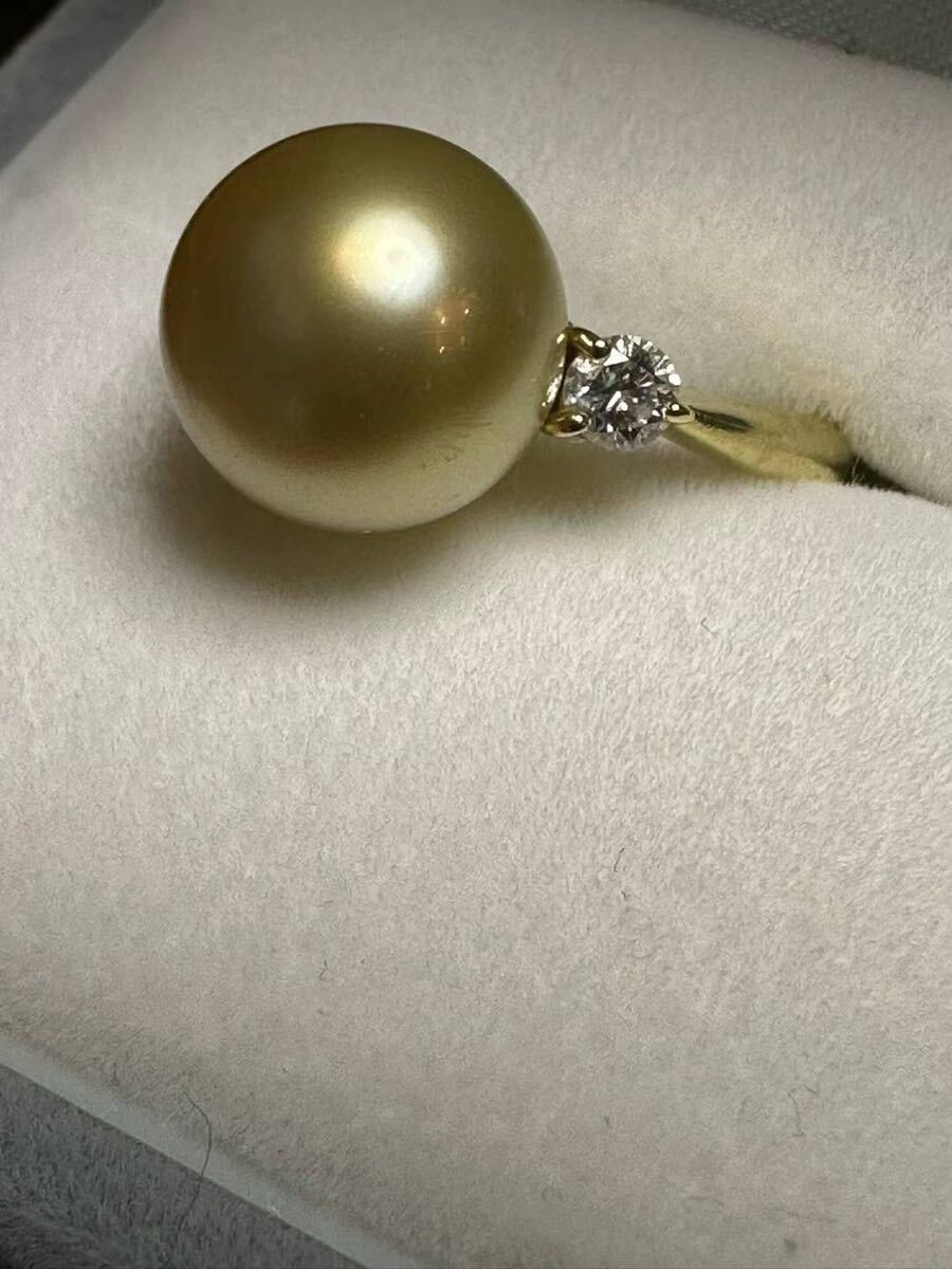 - ★ゴールデンパール11.7mm★K18WG白蝶真珠 ダイヤ0.29gリング15号