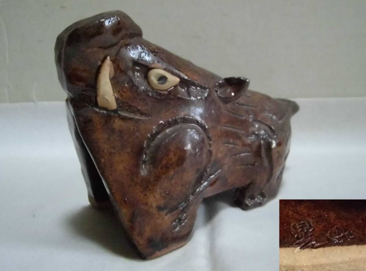 - 干支置物 変わり種 亥 晃山作 猪 いのしし 陶人形 土人形 招福 開運 縁起物 飾り物 オブジェ 陶器 工芸品 レトロ