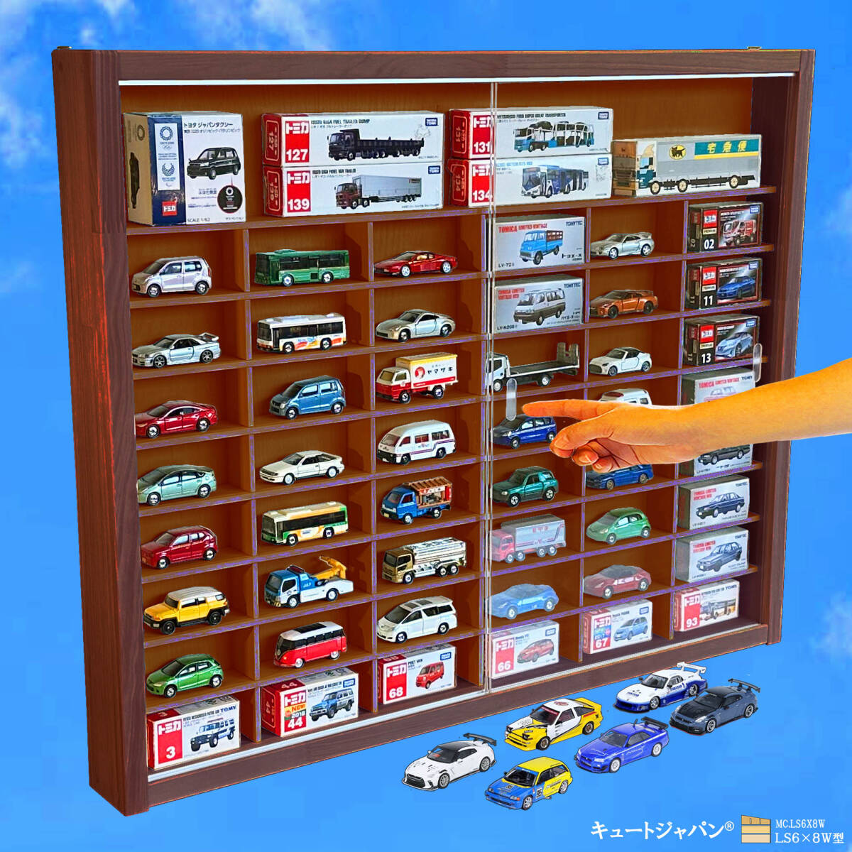 - 【送料無料★】お片付け!マホガニ色全塗装 木製ミニカー収納ケース48台・大型サイズ収納可 アクリル障子付 日本製 LS6×8W型