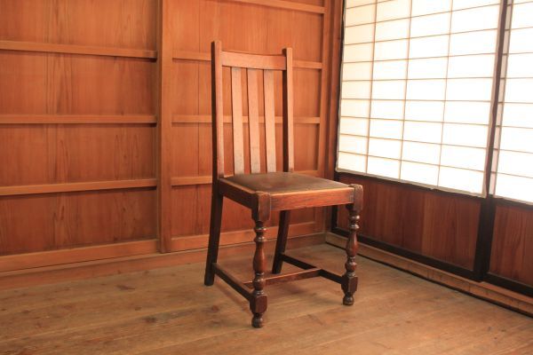 - 【旧家蔵出し】★アンティーク 家具『ろくろ脚 古い革張りのチャーチチェア』★(検:ビンテージ/レトロ/喫茶店/椅子/イス/当時物)0905G