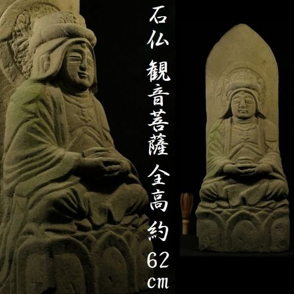 - 【 恵 #1613 】 石仏 観音菩薩 坐像 全高 約 62cm 良いお顔の観音様です 検:仏教美術/仏教工芸/仏像/仏様/置物