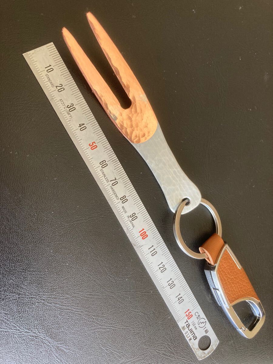 > 銅工房手作り 純銅製グリーンフォーク二本歯 めっちゃ!使い易いフォークです ブラウンキーホルダー付き お名前入れサービス中