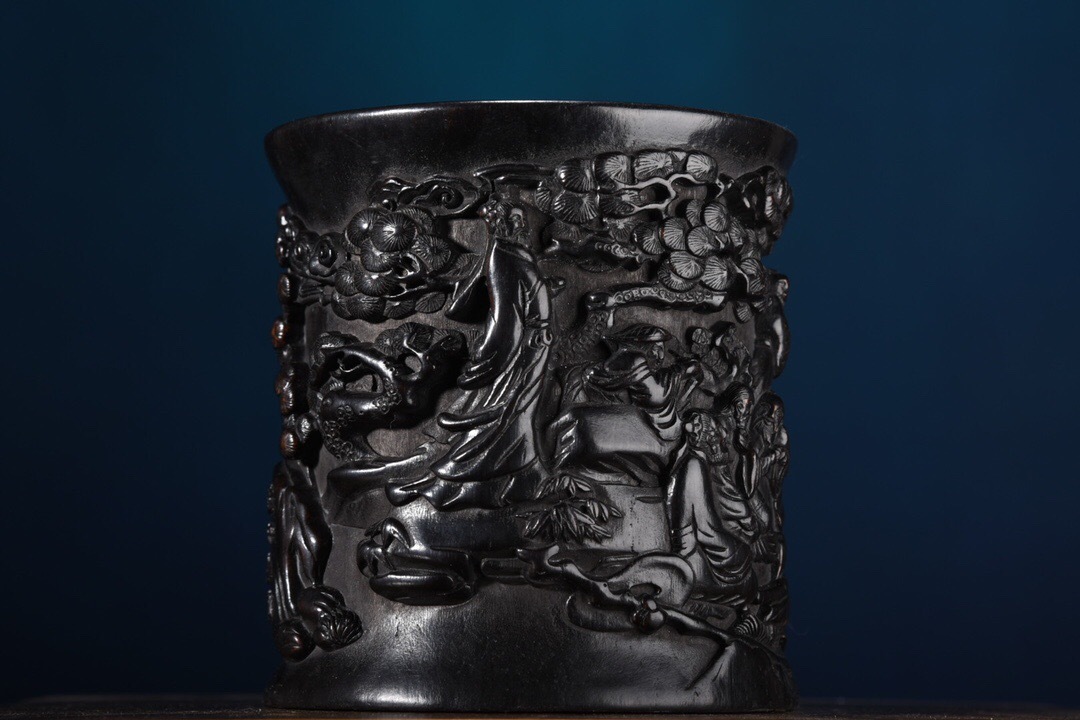 - ▽鴻▽ 烏木製 細密彫 飲中八仙紋 筆筒 置物 古賞物 中国古玩 中国古美術