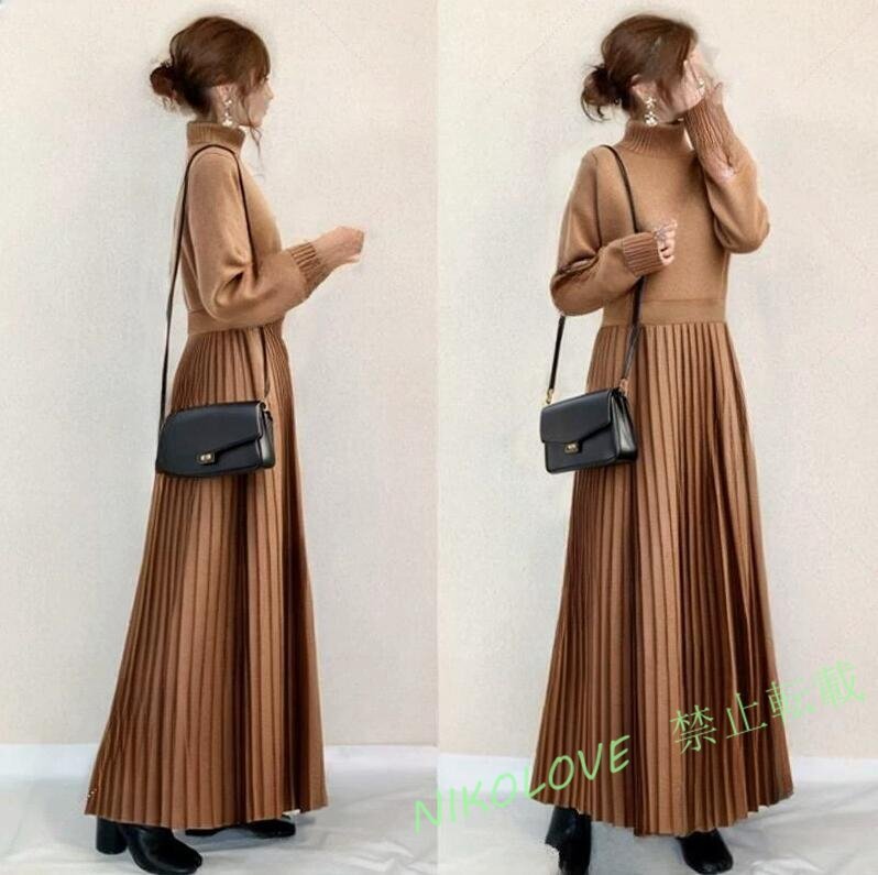 - 新品 ワンピース レディース ロングワンピース プリーツワンピース ハイネック ニットワンピース 着やせ 大人 カジュアル 着痩せ