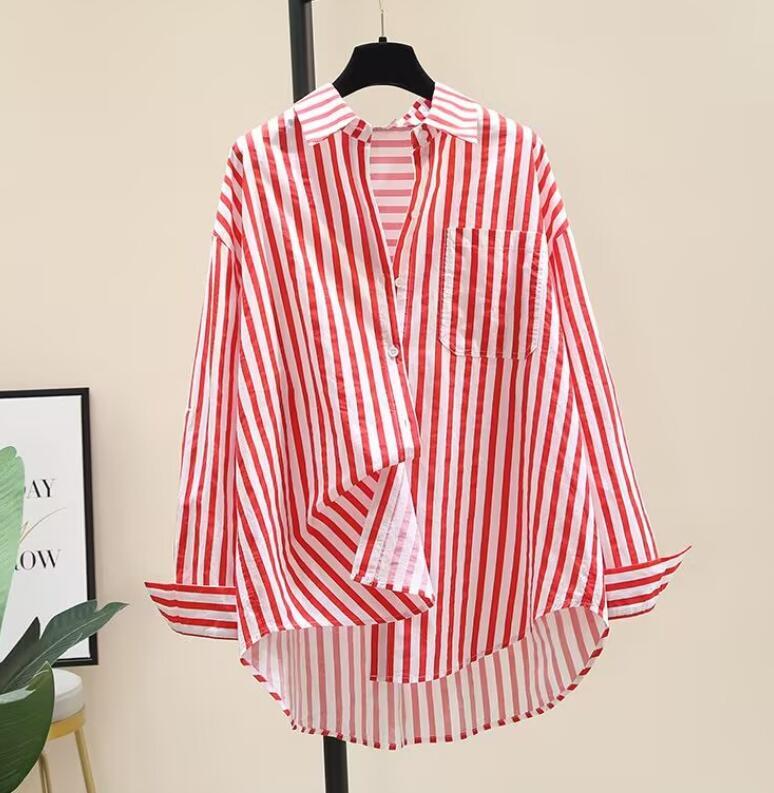 - 春夏新入荷 * トップス 羽織 アウター シャツ ボーダー柄 シンプル 長袖 カジュアル お出かけ レディース 大きいサイズ チュニック *赤