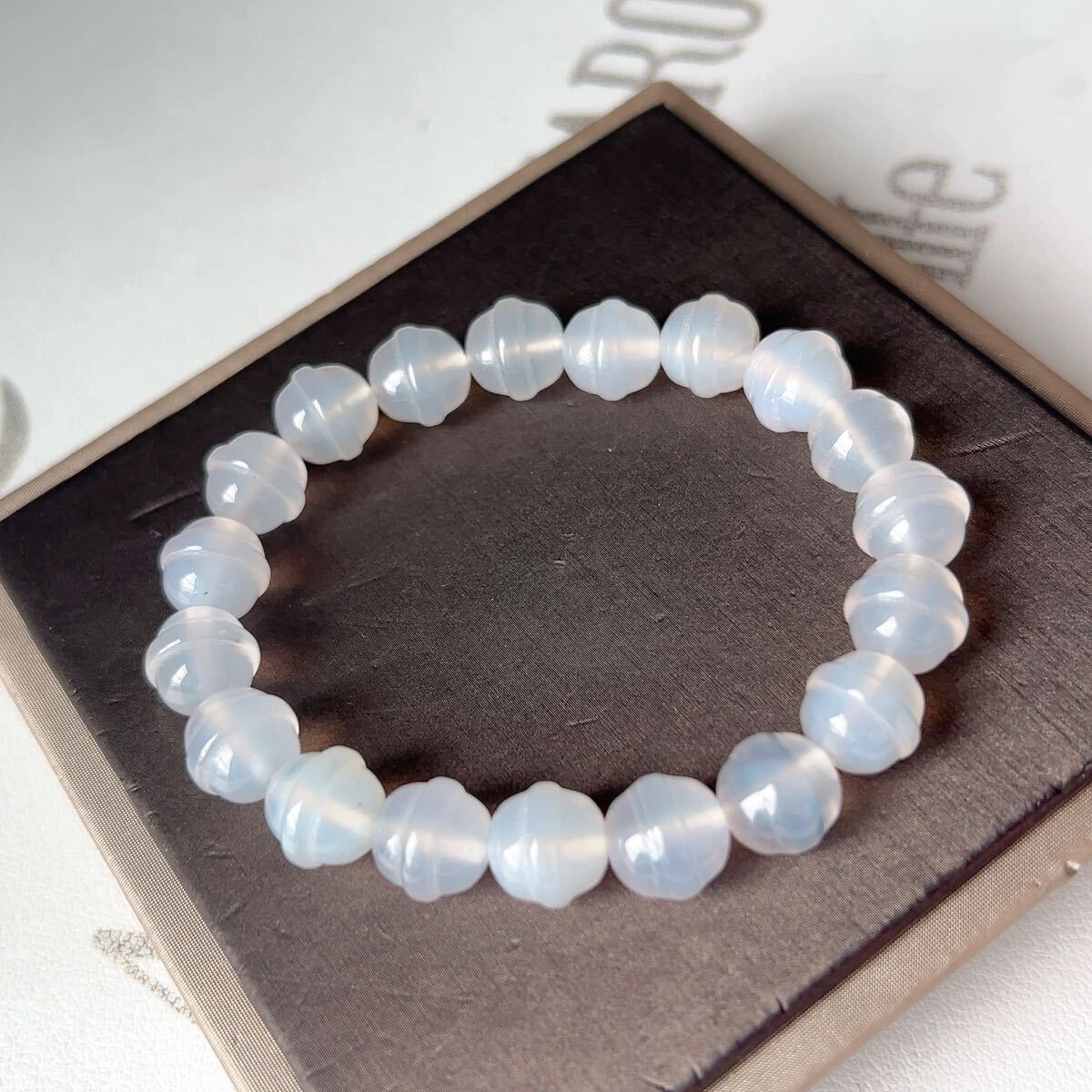 - ◇白瑪瑙(ライチ色)◇鈴形彫刻◇メノウ◇アゲート◇ブレスレット◇パワーストーン◇天然石◇巾着袋付き◇プレゼントにも032B4108