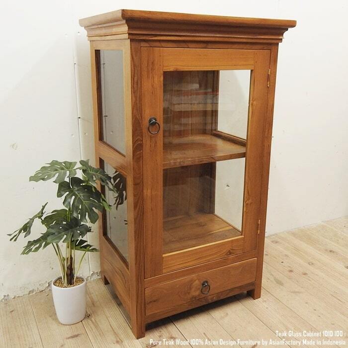 - オールドチーク無垢材 ガラスキャビネット1D1D 100cm NA ナチュラルブラウン 2段 本棚 飾り棚 ブックシェルフ 2段ラック 整理棚 食器棚
