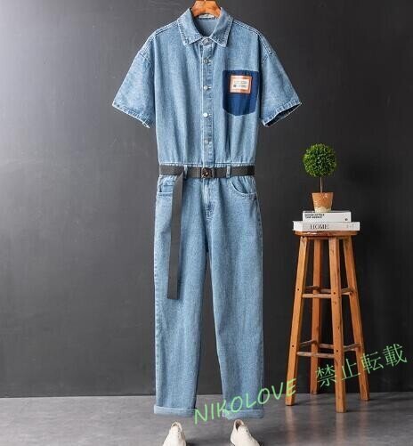 - 新品 つなぎ 作業服 オールインワン デニム つなぎ オーバーオール ペインターパンツ 半袖 カーゴ サロペット M~XL ブルー