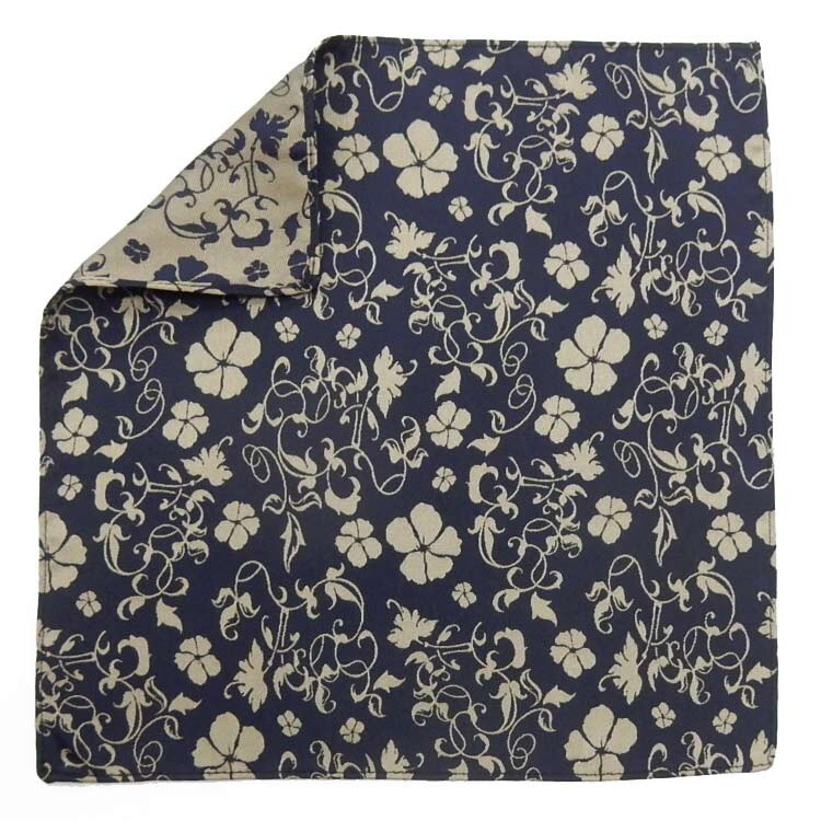 - 日本製 ポケットチーフ メンズ 結婚式 リバーシブル 濃紺 ネイビー/ゴールドベージュ ボタニカル柄(植物) 絹100% メール便可 ACC-RE13