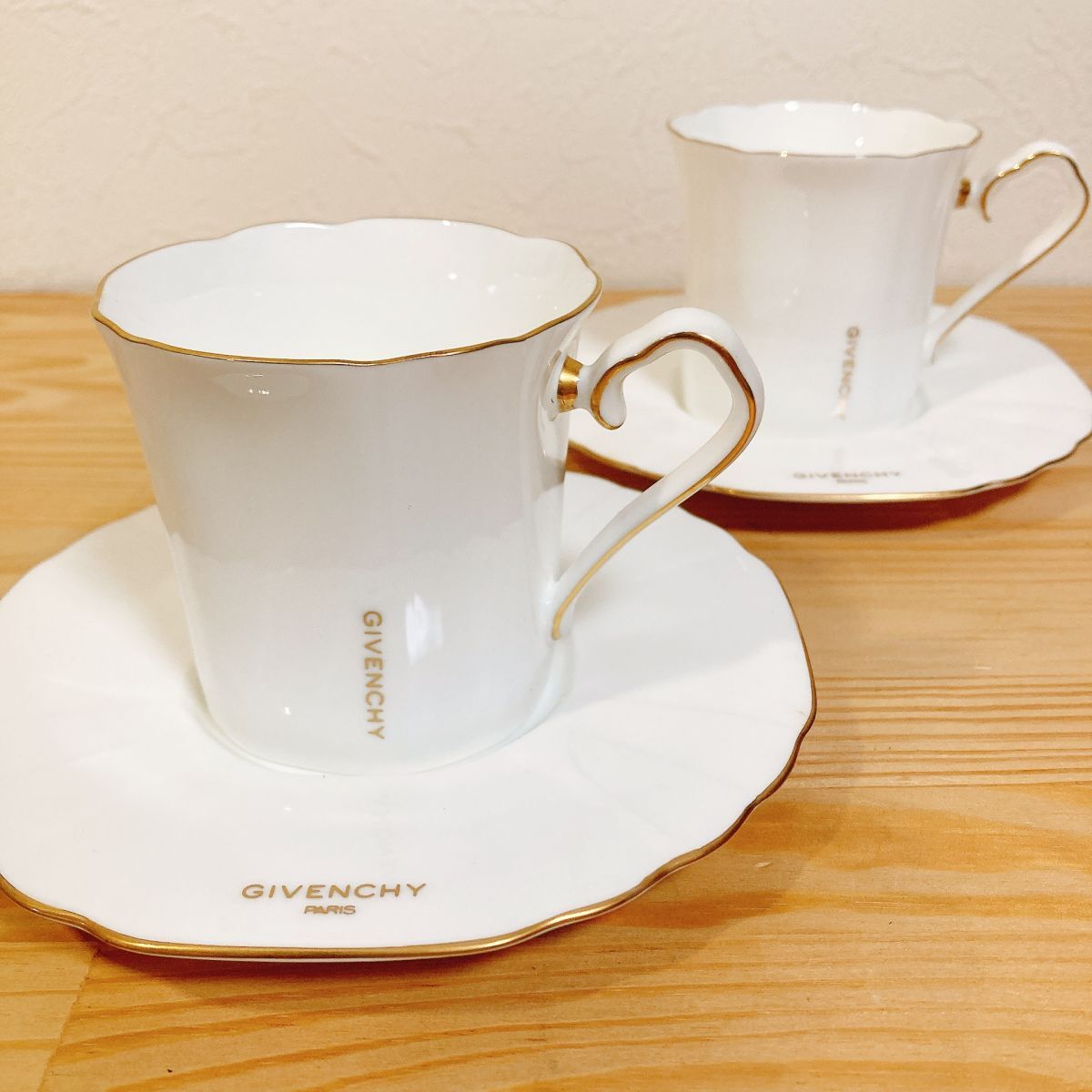 - 【中古】<美品>GIVENCHY ジバンシー カップ&ソーサー 2客セット ボーンチャイナ 金縁 金彩 ホワイト系 保管品★A2504-0179
