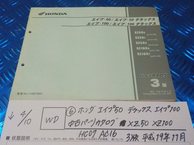 > WD●〇★(6)ホンダ エイプ50 デラックス エイプ100 中古パーツカタログ XZ50 XZ100 HC07 AC16 3版 平成19年11月 7-4/10(こ)