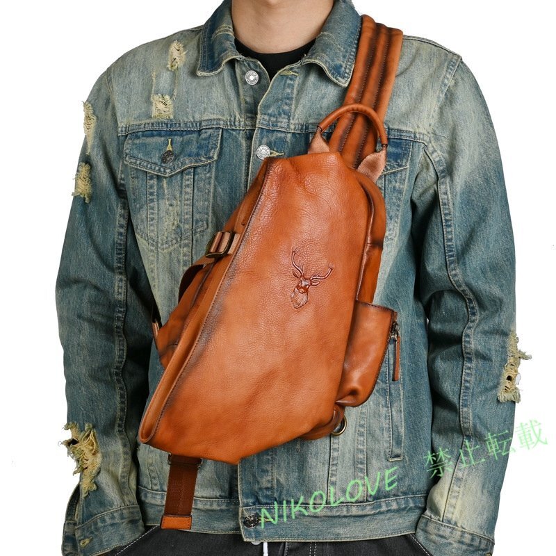 - 新品 メンズ 本革 ボディバック レザー 男性 ワンショルダーバッグ 斜め掛けバッグ 牛革 大容量 カジュアル 鞄 左右肩付替え コーヒー