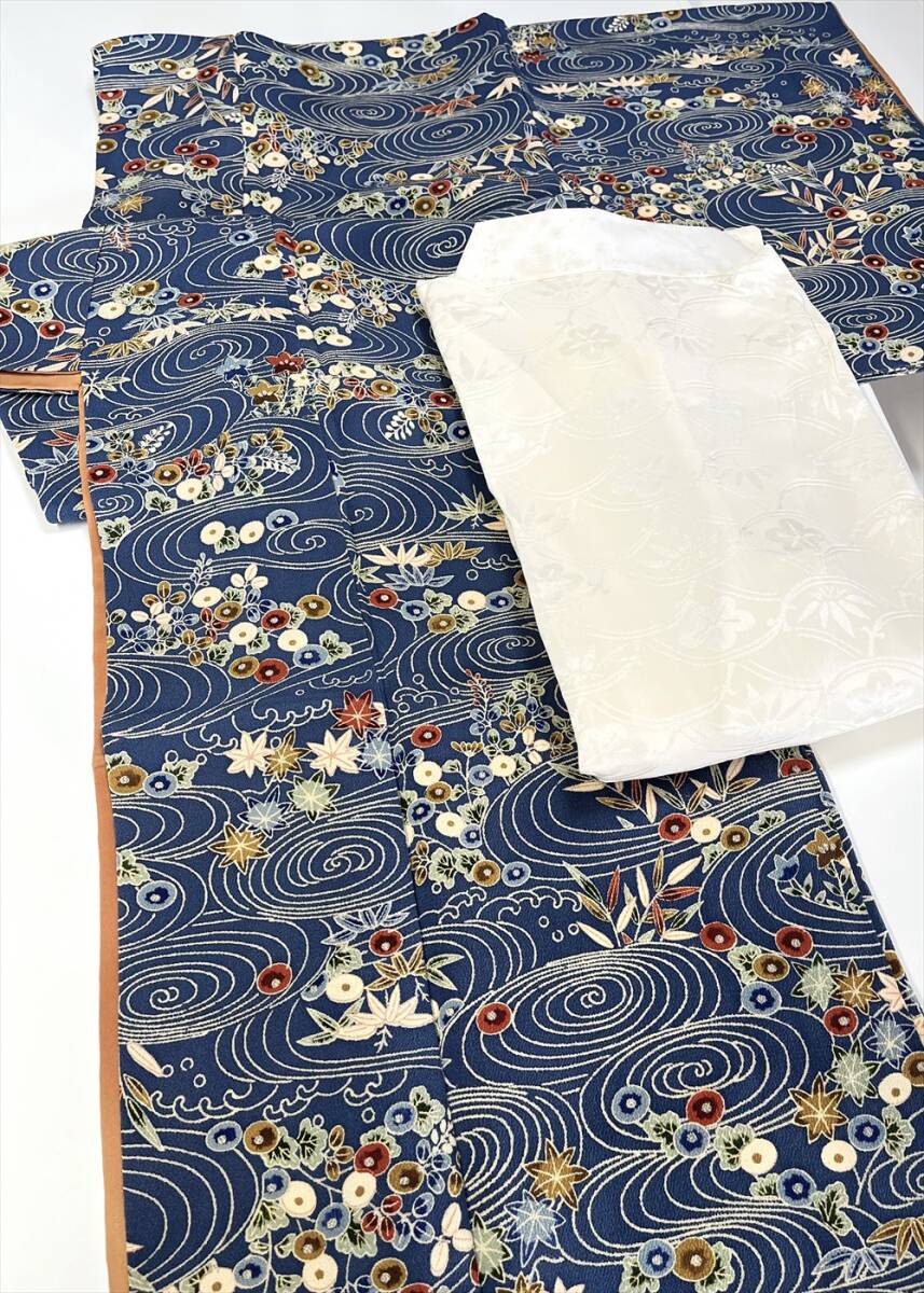 > 花とら●リサイクル着物と長襦袢 小紋 袷 ちりめん 灰青 着用可能 リメイク 素材 波 渦 笹 秋草 250408