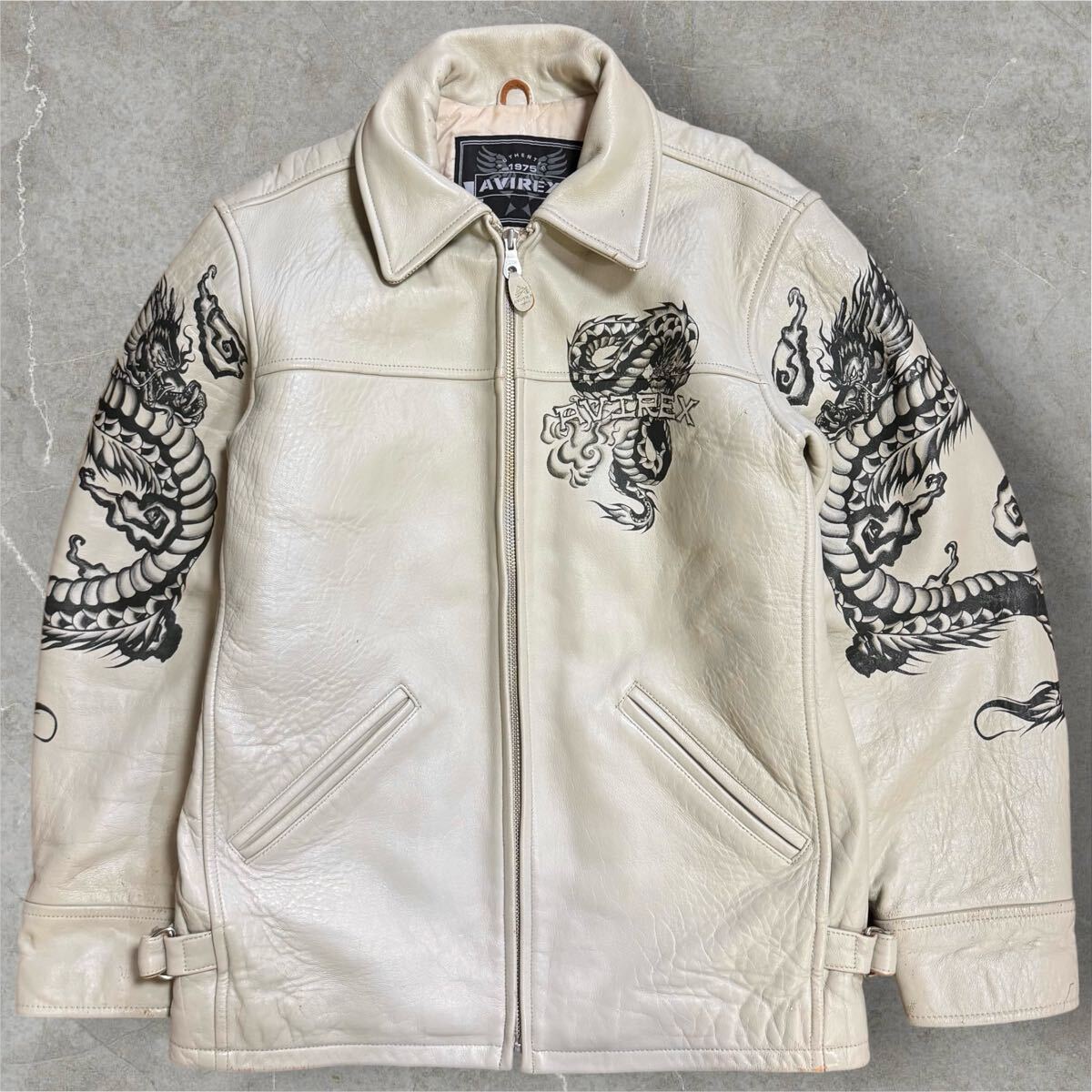 > 【300着限定/雰囲気抜群】AVIREX ドラゴン オールレザー バーシティージャケット 表記S 着用感ML アイボリー