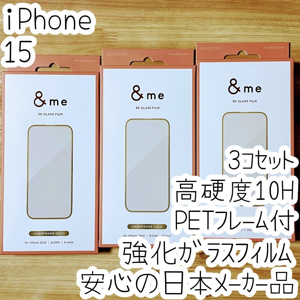 - 3個 iPhone 15 強化ガラスフィルム 3D設計PETフレーム付 高硬度10H 高光沢 液晶保護 シール シャンパンゴールド エレコム 309