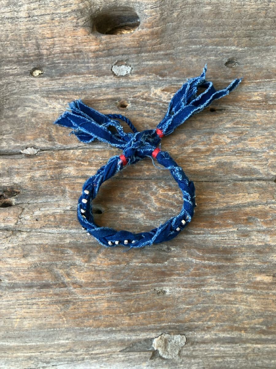 - ガイジンメイド、藍染め生地リメイク編み込み+カレン刻印シルバーリストバンド