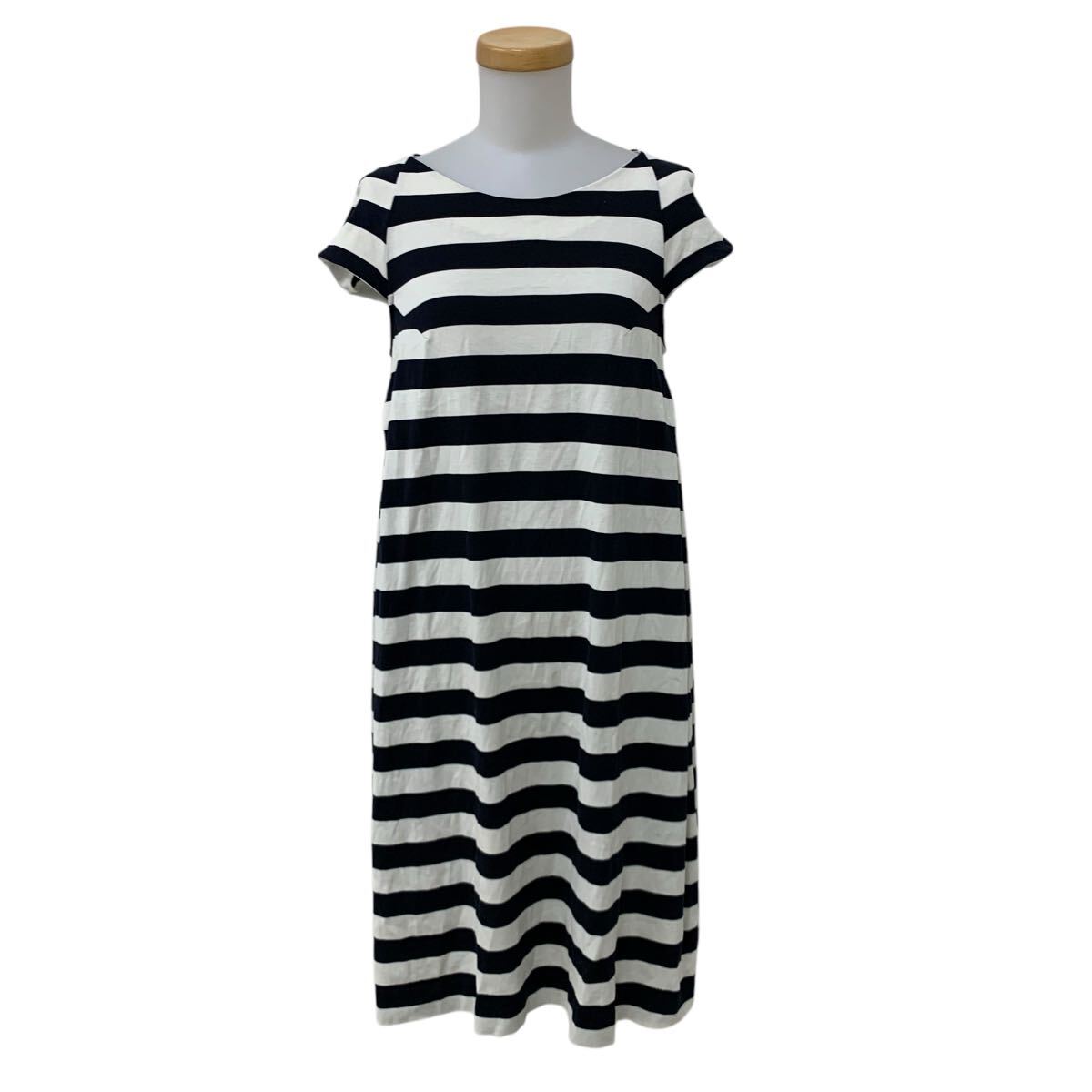 > B449-34 AMACA アマカ ワンピース ワンピ 半袖 膝丈 スカート カジュアル シルクブレンド ホワイト × ネイビー ボーダー柄 レディース 38