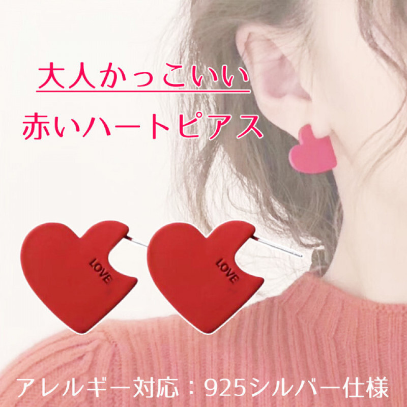 - 016 レディース アクセサリー 赤 ハート ピアス 低アレルギー スタッドピアス ハートピアス シンプル