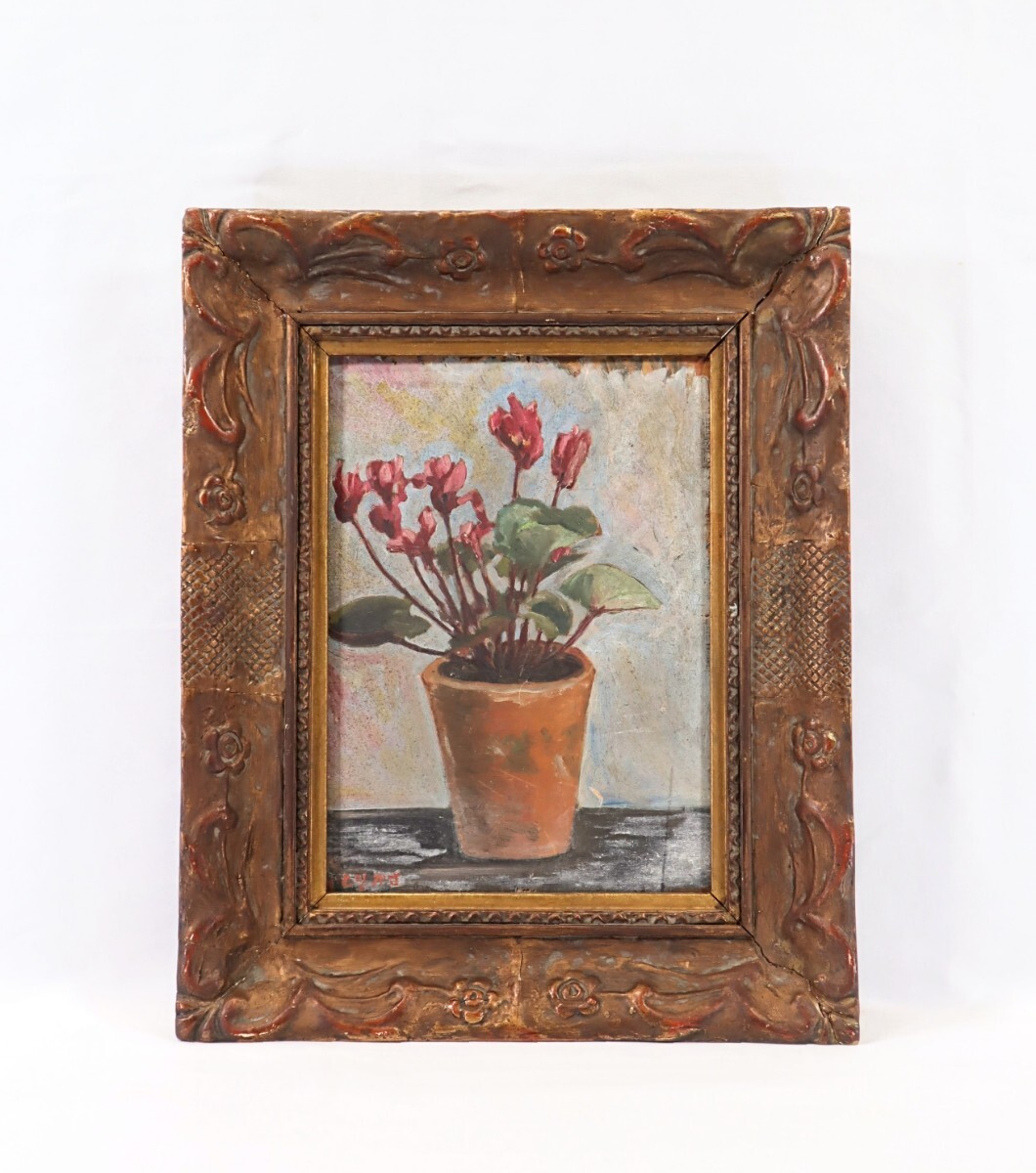- 「模写」坂本繁二郎 油彩「シクラメンの図」画寸 F4 福岡県出身 森三美に師事 国立博物館へ貸出に際し預かり証有り 東洋的な自然観 10721