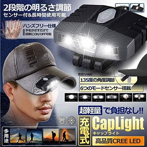 - ★★超軽量 キャップライト 明るさ 2段階 センサー付 充電式 長時間使用 釣り モーション 角度調節 キャンプ ハンズフリー