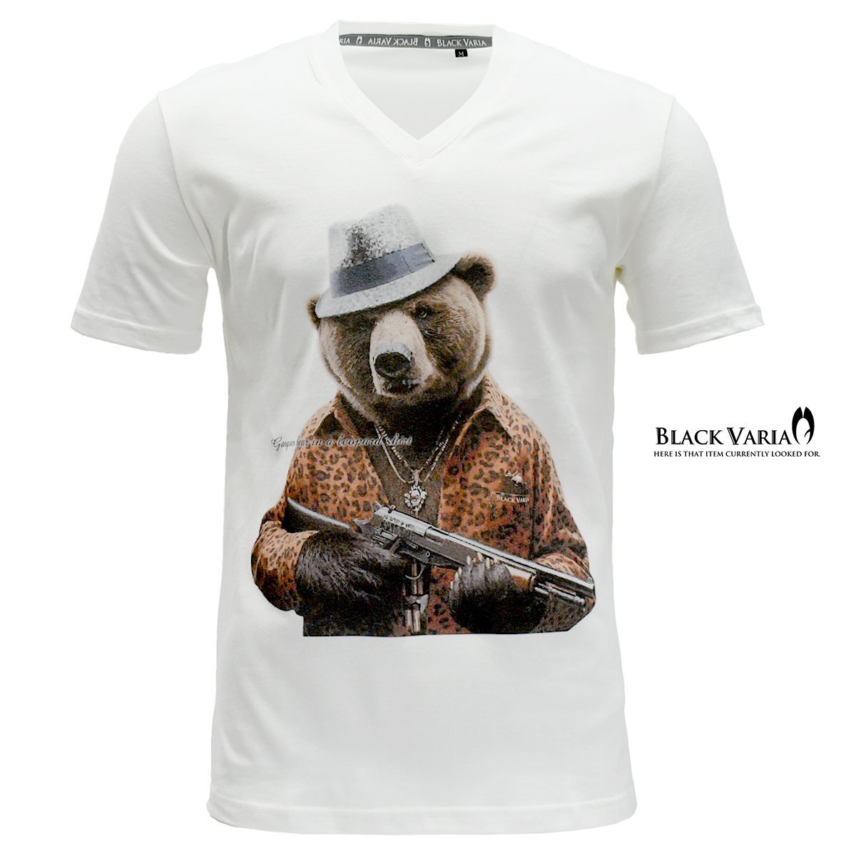 - zkk072-wh BLACK VARIA ハンターベアー 熊 豹柄 ワイルド 綿100% 半袖 Vネック Tシャツ メンズ(ホワイト白) XXL プリント 細身 VT VTシャツ