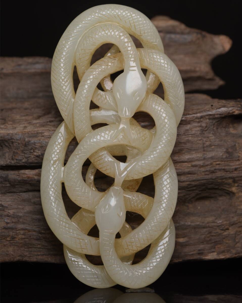- 【超珍館蔵】和田玉製 細密彫 玉蛇 置物 賞物 古賞物 古美術品 稀少珍蔵品