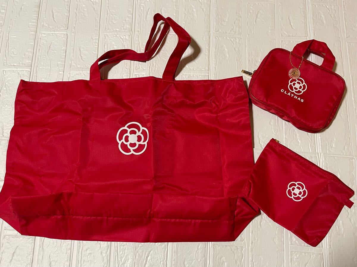 - 新品難あり☆クレイサス CLATHAS バッグポーチセット 3点 赤色 レッド 肩掛けバッグ 旅行 トラベルに エコバッグにも トートバッグ