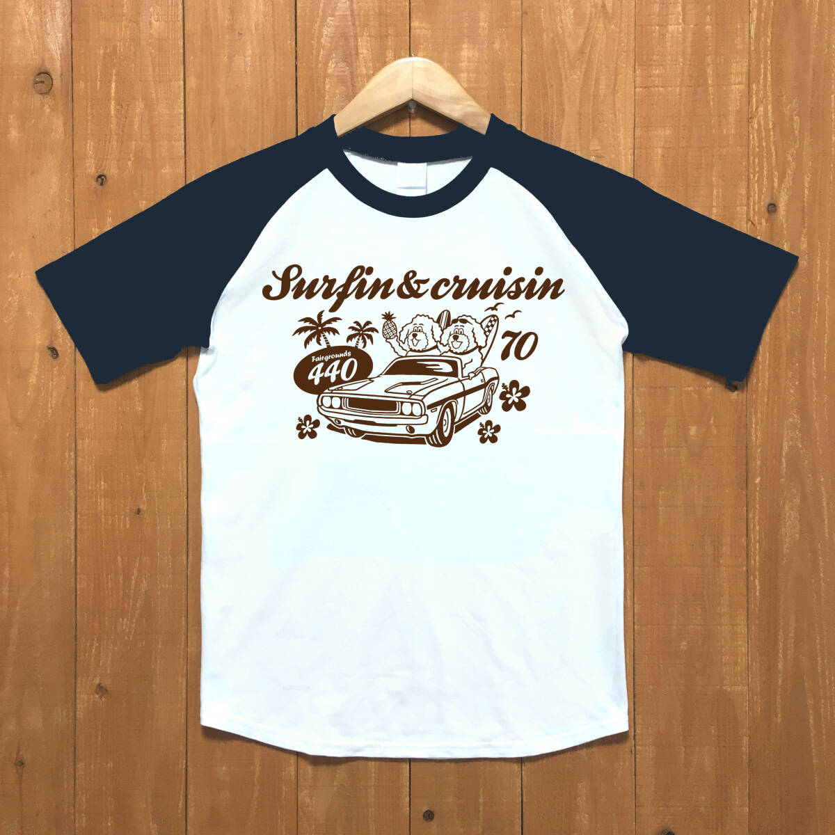 > ■SURFIN & CRUISIN ラグランTシャツ■Sサイズ(ネイビー袖xブラウン) モパ- MOPAR DODGE CHALLENGER チャレンジャーサーフィン