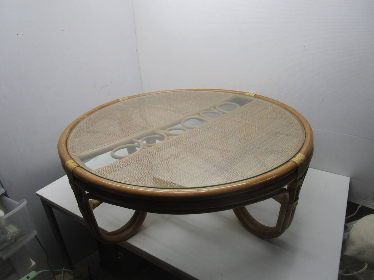 > O932★ (籐)円テーブルガラス丸 テーブル トップ ラウンド ガラス ロー テーブル ヴィンテージ家具★中古品