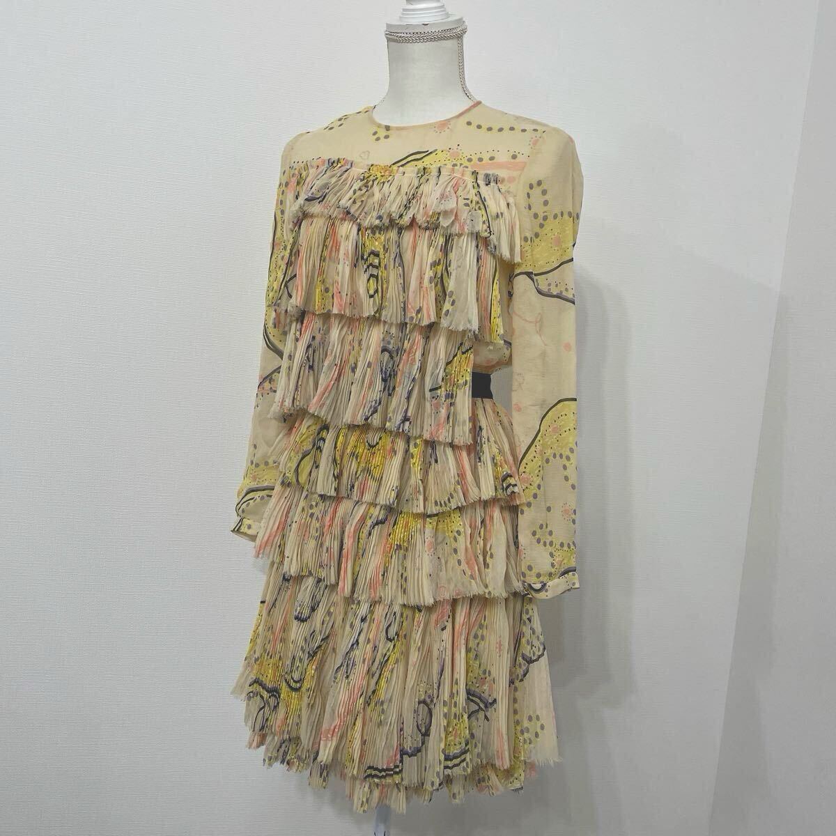 - 【256】シルクドレス パーティーワンピース 発表会 結婚式 上質 プリーツ シルクワンピース フリル シルク100 ベージュ×ピンク
