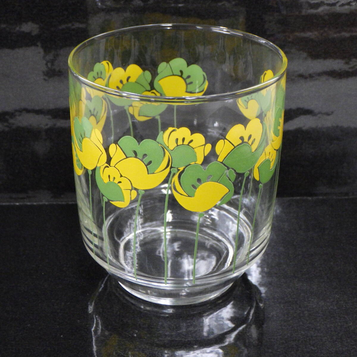 - 昭和 レトロ 黄色 緑 花柄 プリント グラス
