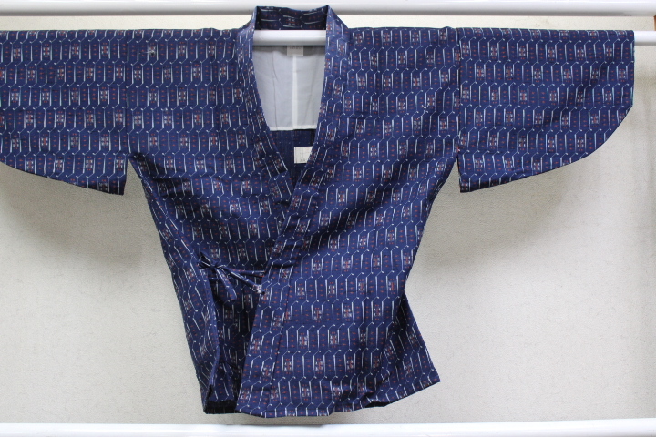 - きもの今昔8460 おしゃれコート 引っ張りコート ウール染絣 紺色地長亀甲に赤絣入り メーカー仕立て
